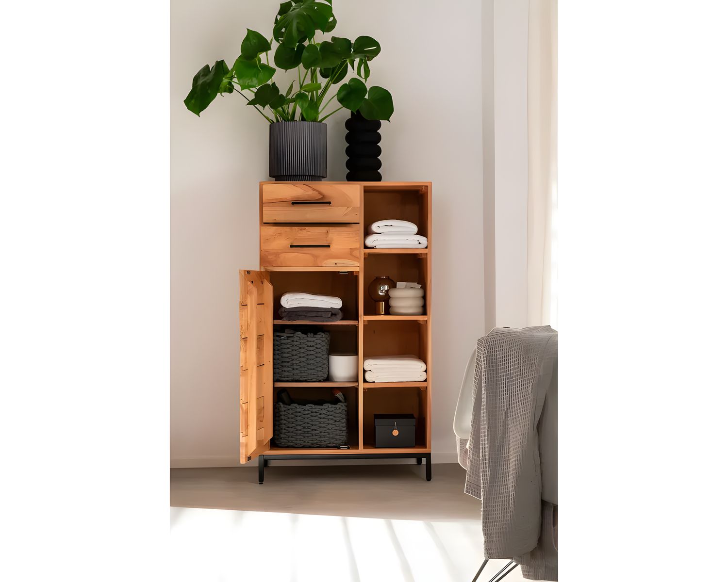 Gefertigt aus massivem Akazien- oder Sheeshamholz steht dieser Unterschrank für Langlebigkeit und Robustheit. Die natürliche Maserung des Holzes macht jedes Stück einzigartig und bringt ein Stück Natur in Ihr Zuhause.